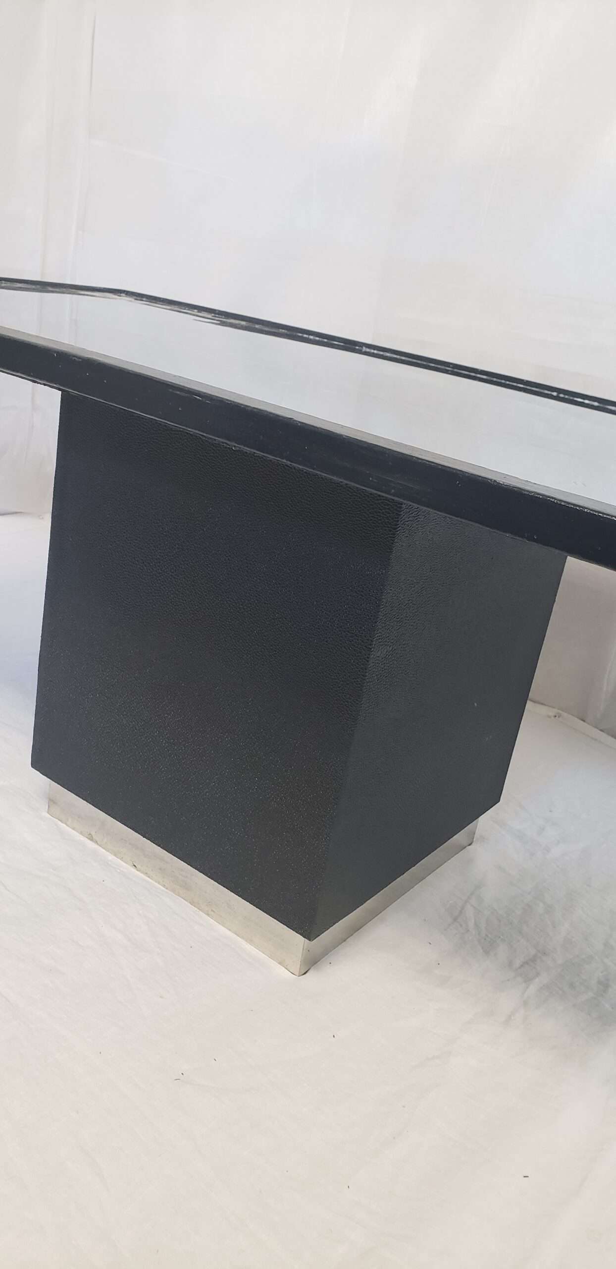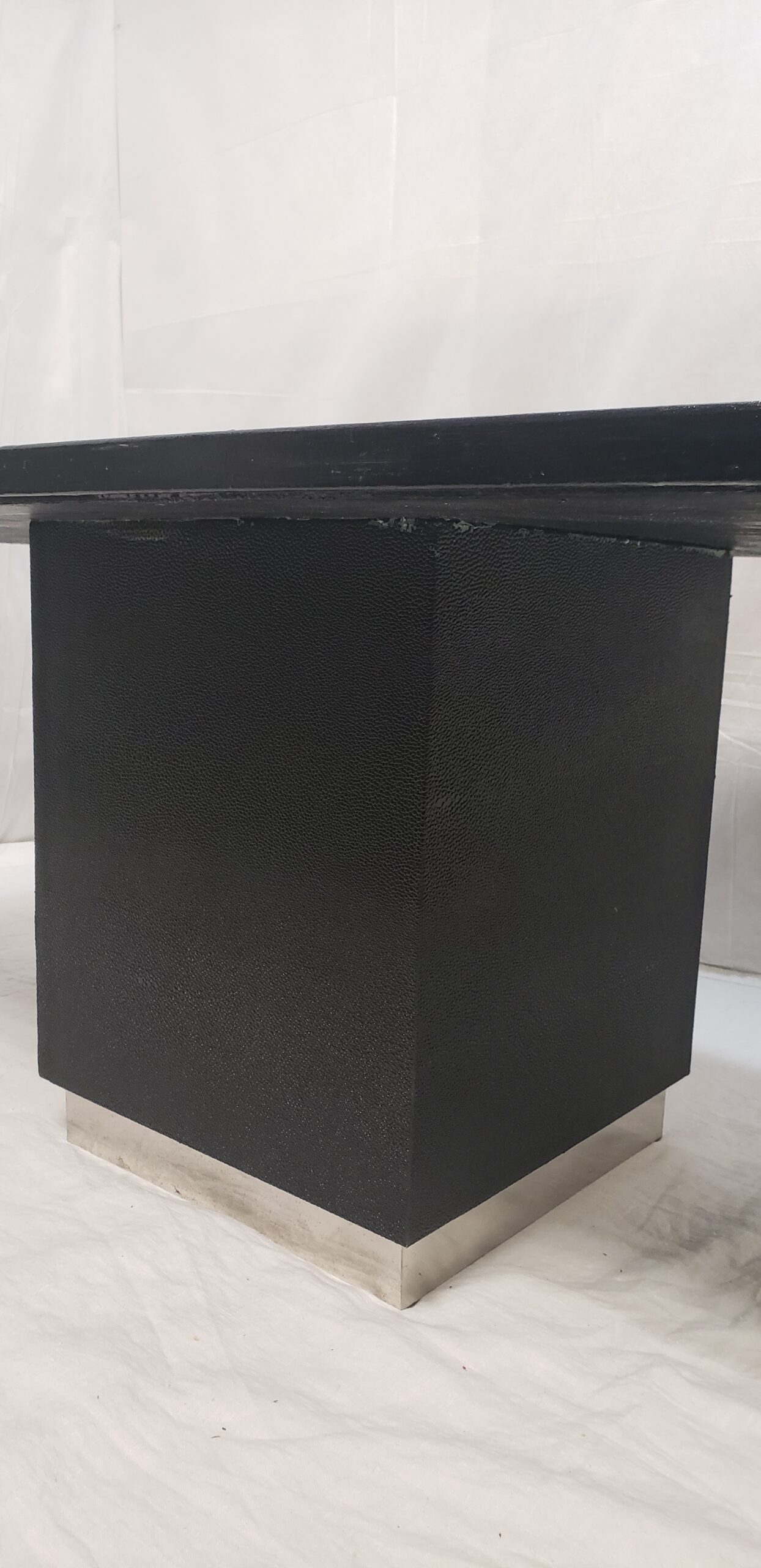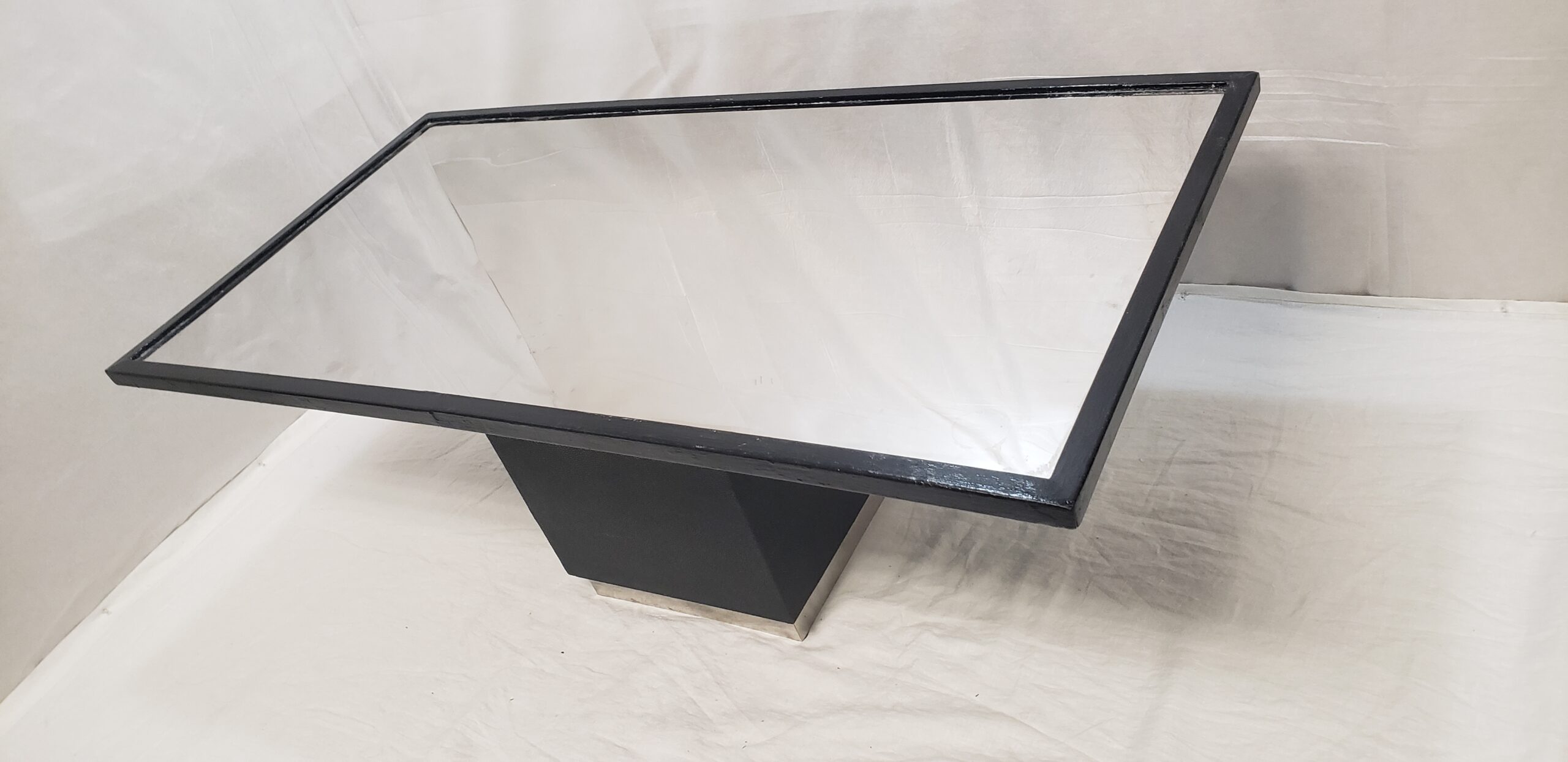 The handcrafted Excelsior pays homage to my father and the craft of stainless steel polishing. It features stainless steel polished to a mirror finish by him before his retirement. This piece of steel has been in storage for decades and has been brought back to life. The tabletop is 49“x19“mirrored stainless steel edged by black pine. It rests on top of a pebbled black faux leather cube with mirrored chrome at the base. The simplicity of this table gives it its beauty.