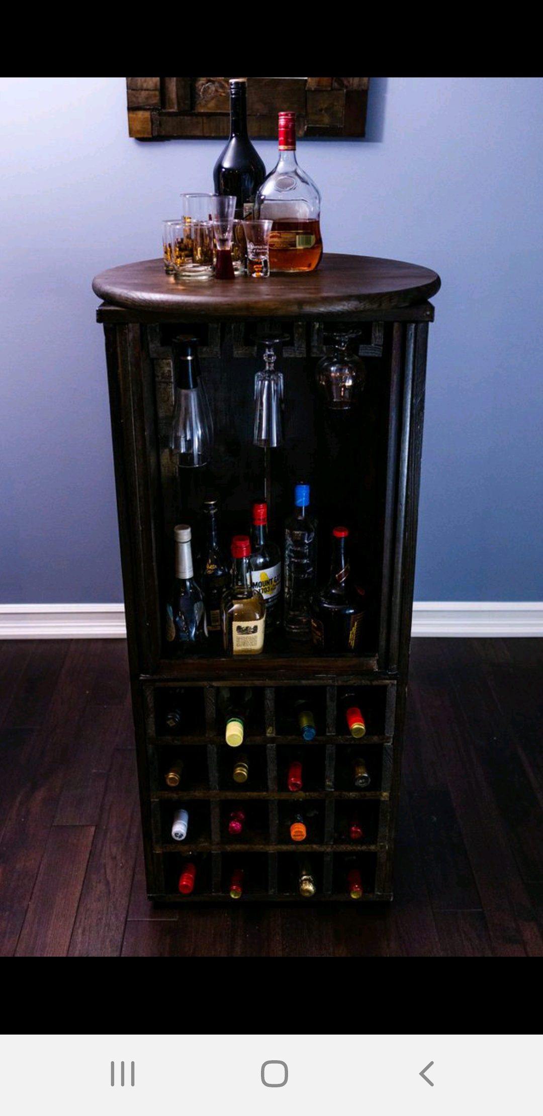 Standing 51.5 inches tall, the Biggie is the largest in the handcrafted FAY Wine bar collection. It features a 24“in diameter round tabletop, space to hang up to 15 wine glasses, an open shelf for liquor bottles or glasses, and cubbies for up to 16 wine bottles. a natural staining process gives a brilliant rustic finish to the pine. The Biggie is an intersection of design, beauty and function.