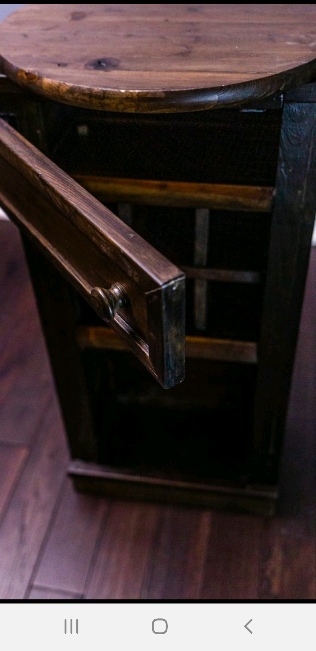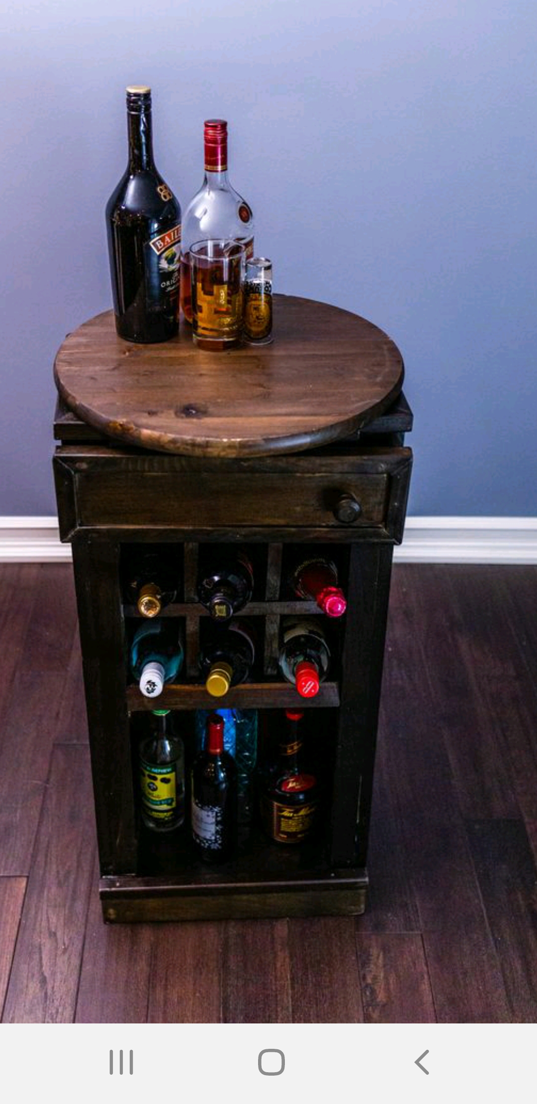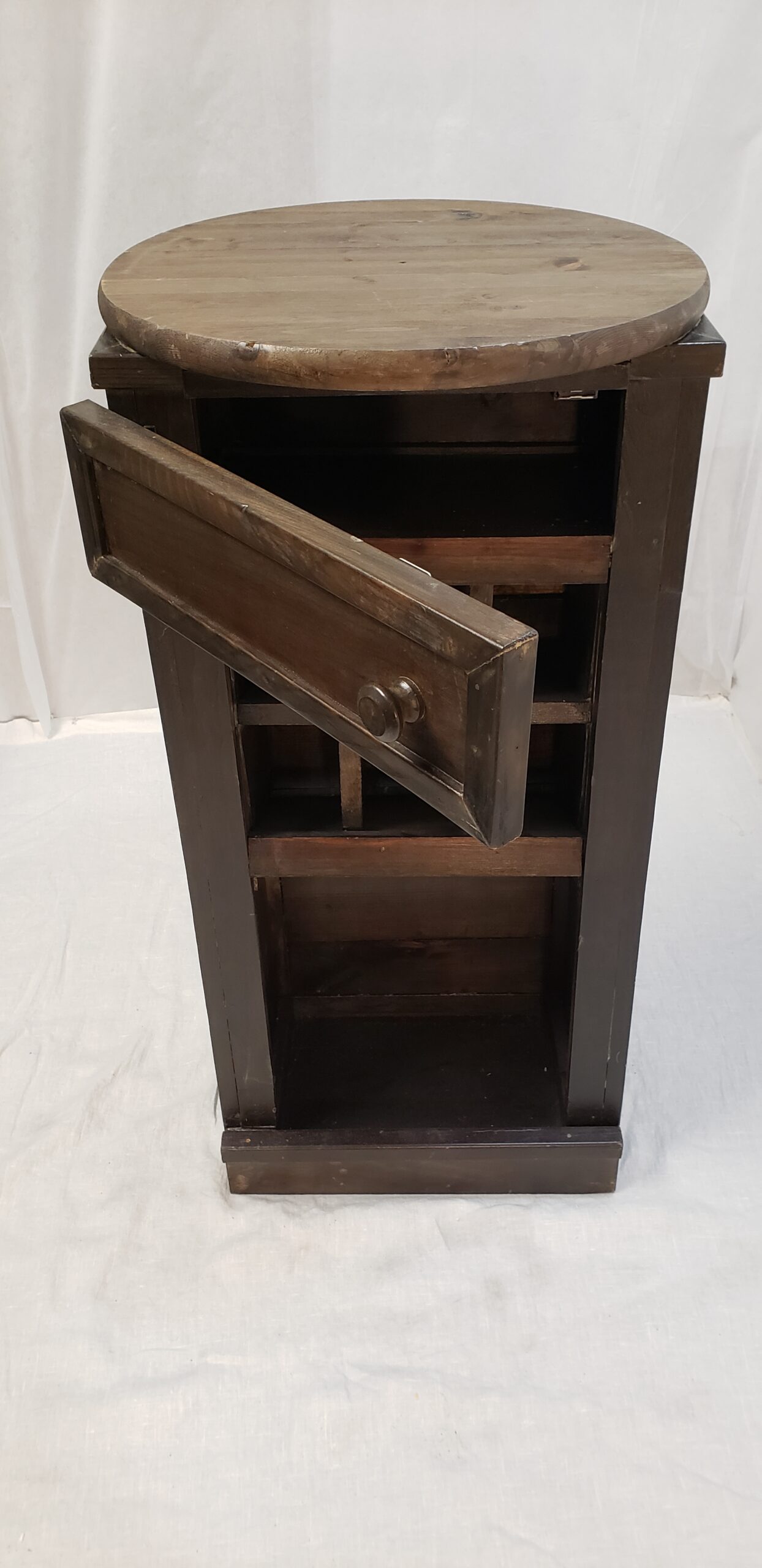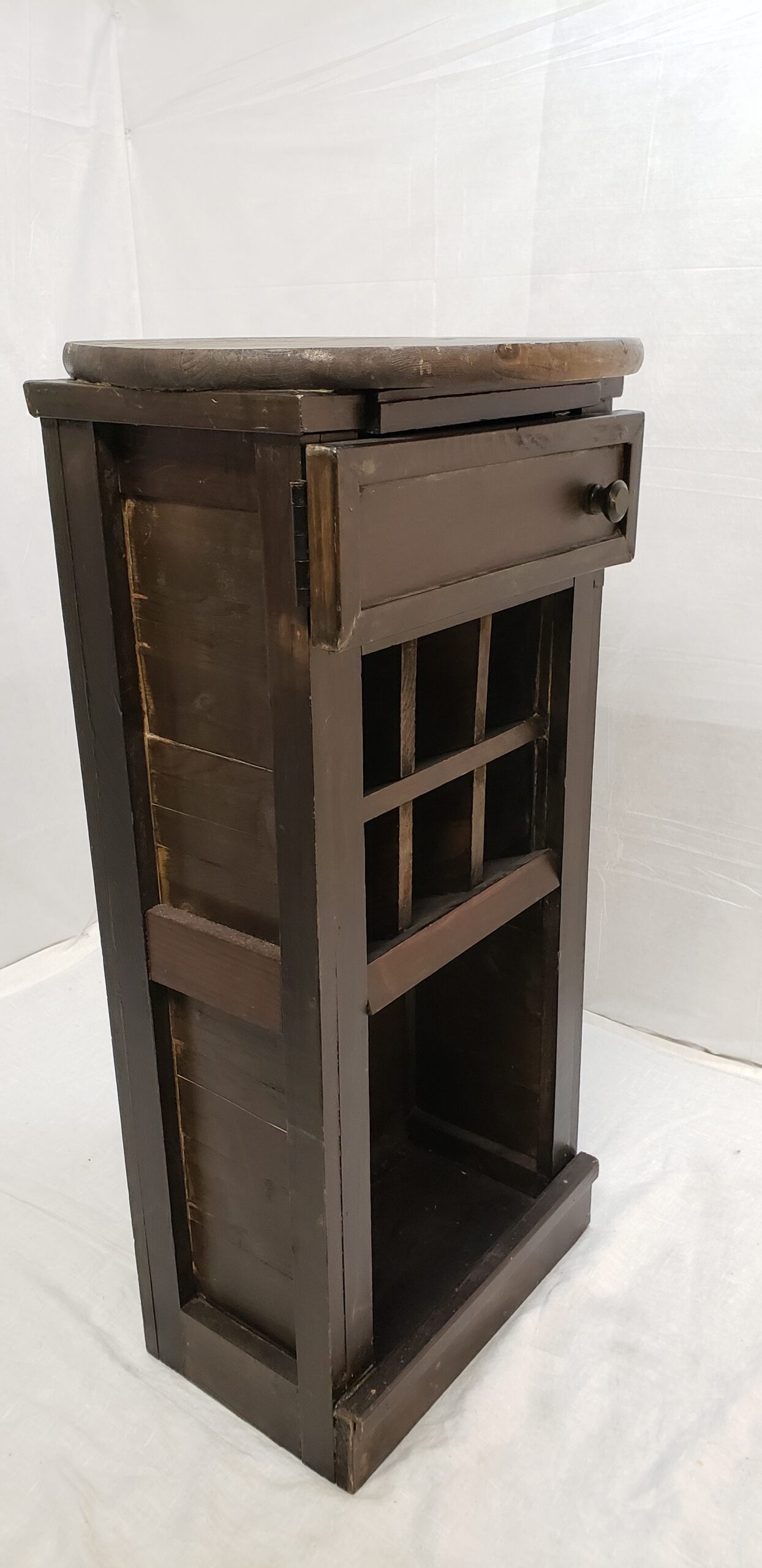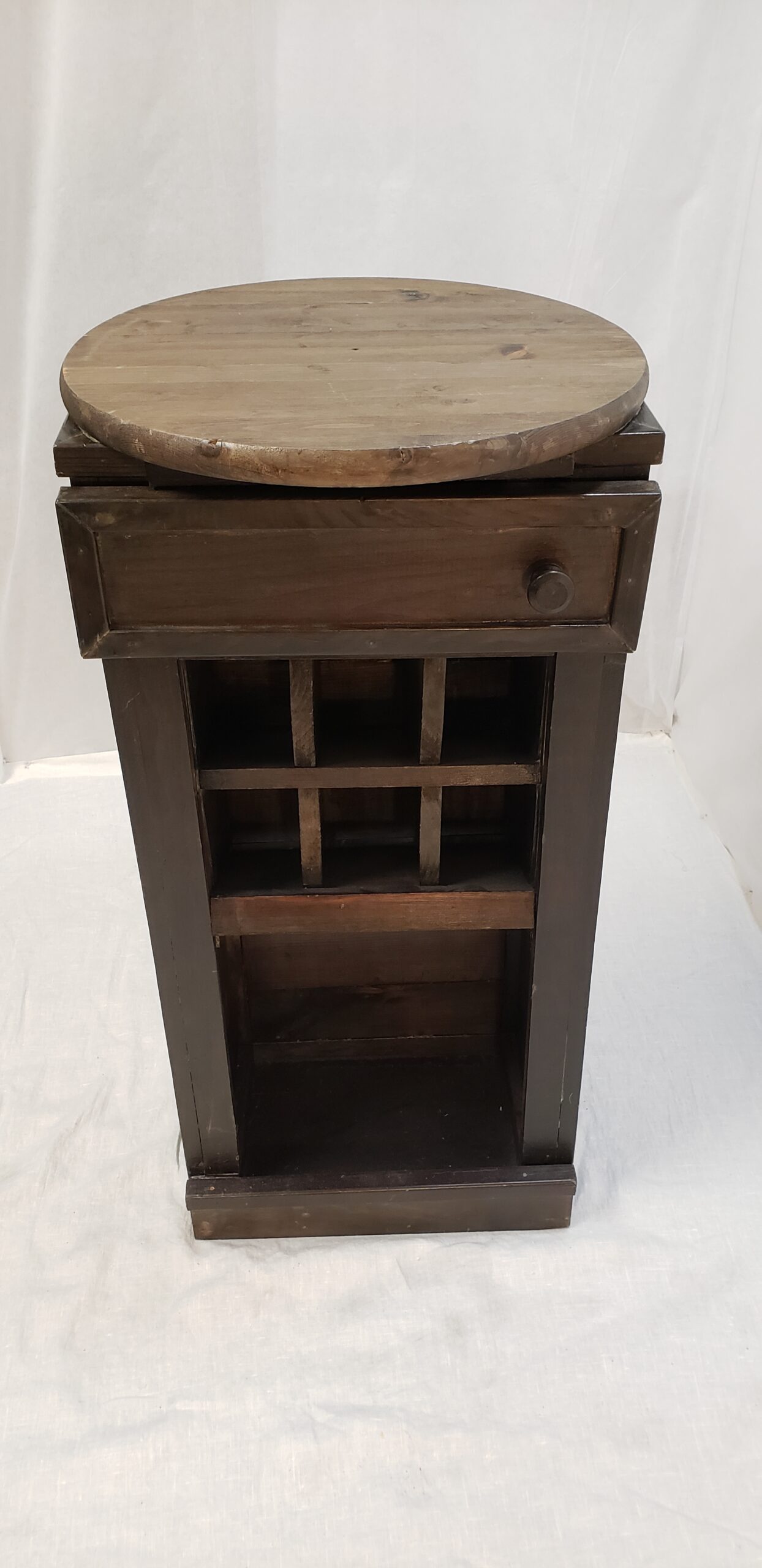 Standing 31.5 inches tall, the Mini is the smallest in the handcrafted FAY Wine bar collection. It features a 19“ in diameter round tabletop, a small compartment with a door to store bar tools, cubbies to hold up to 6 wine bottles, and an open area at the bottom for more bottles. A natural staining process gives it its rustic look. Its compact size is ideal for many spaces.