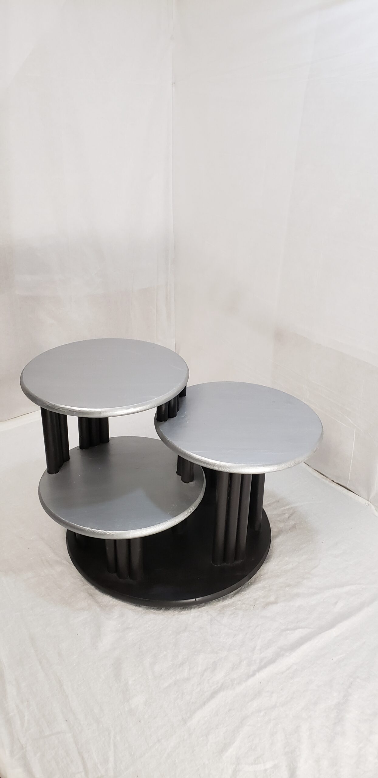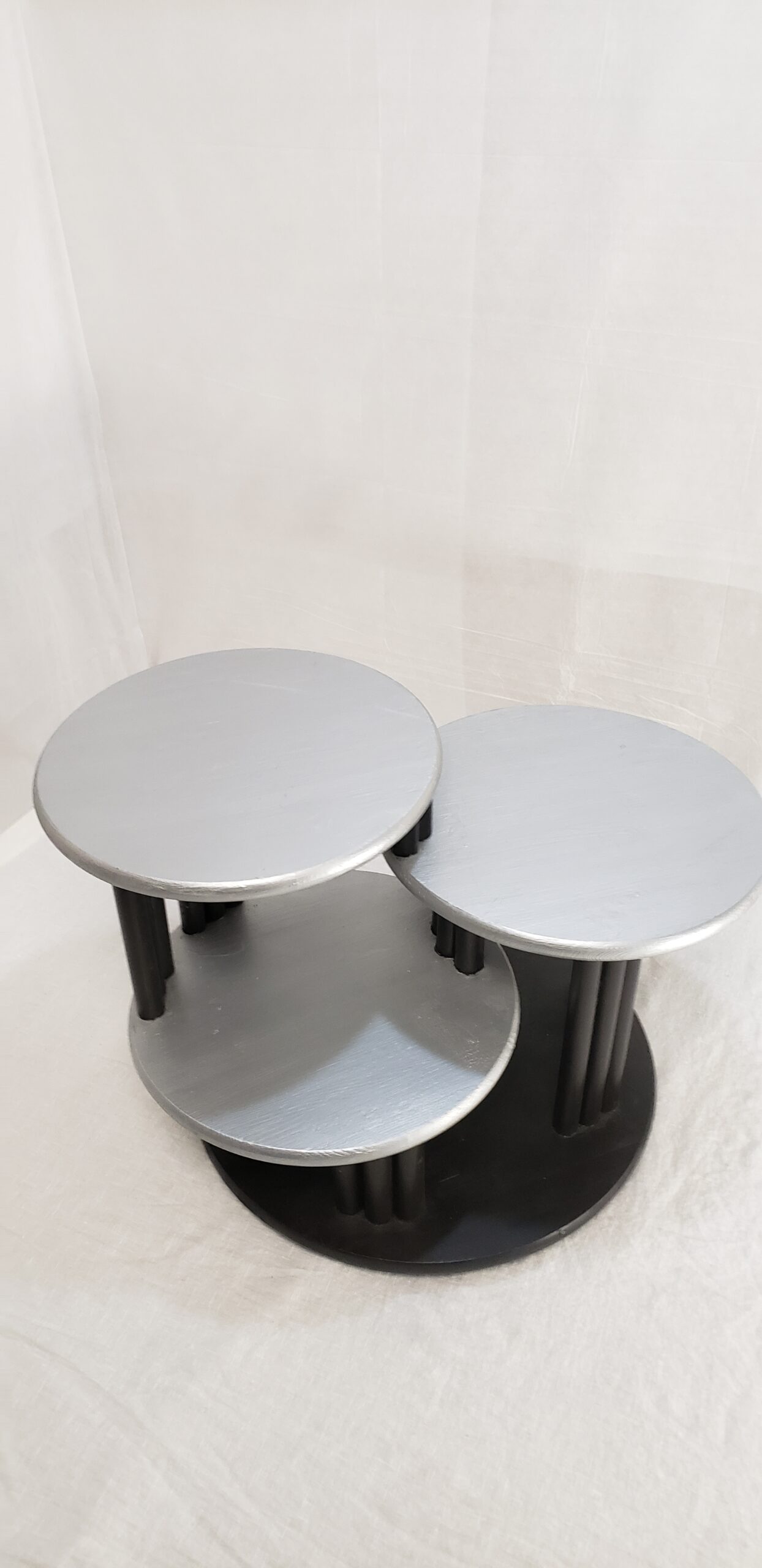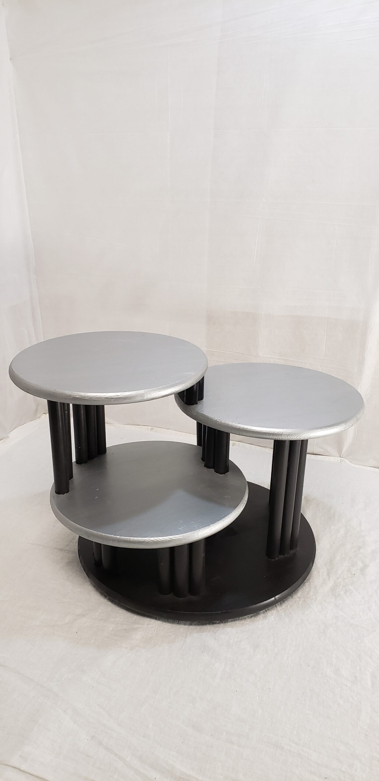 KIBO is a handcrafted display table named after the highest of the three summits on Mount Kilimanjaro. The table is made from pine. Its three plateaus are finished in silver stain, while the supports and base are stained in black. The KIBO is an ideal display table.