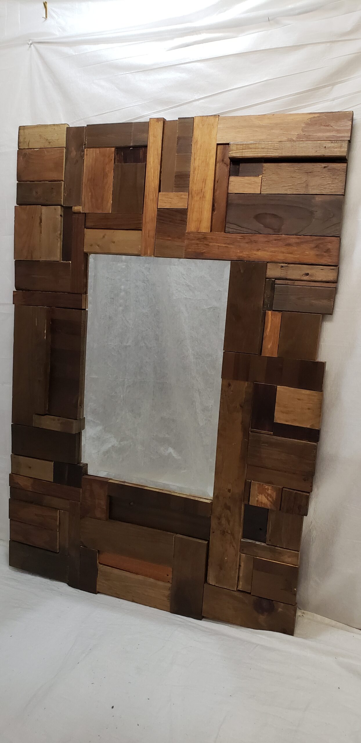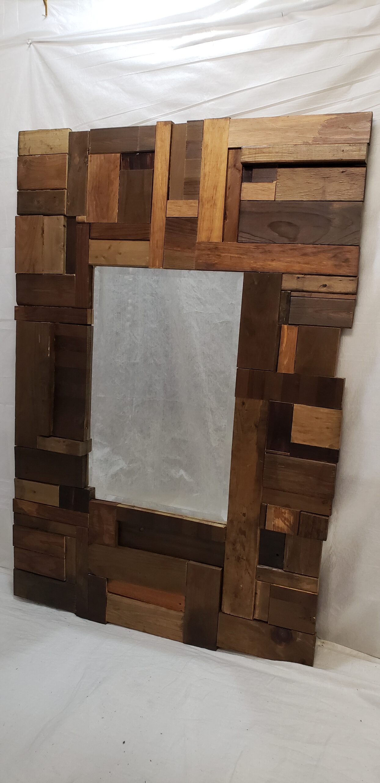 MOSAIC PUZZLE is a set of rustic mirrors that celebrate woods, textures, depths and colour. Each mirror is handcrafted from varying pieces of wood that differ in shape, size and species. The pieces are finished with a natural stain and arranged to form a single piece of wood. Mosaic puzzle mirrors come in varying sizes from small (25“x22.5“) to extra large (63×34).