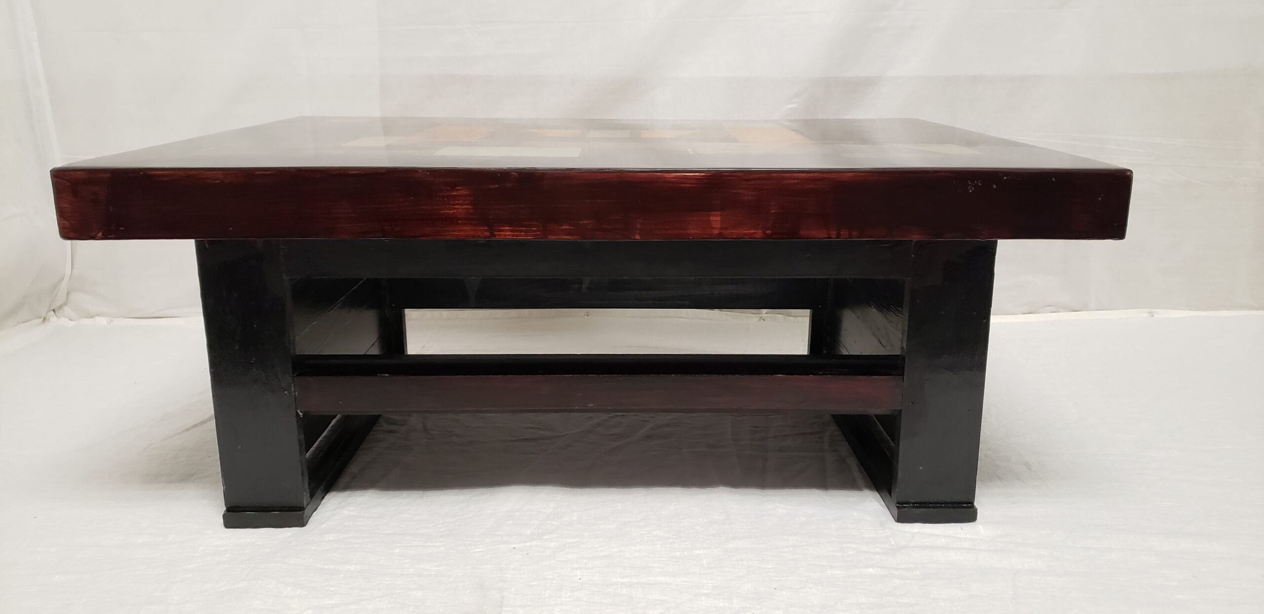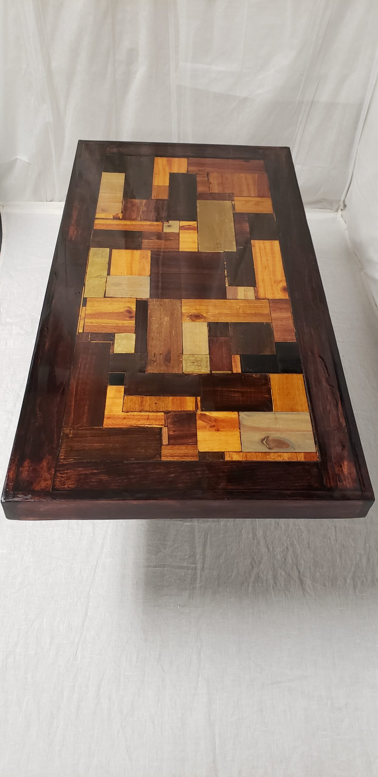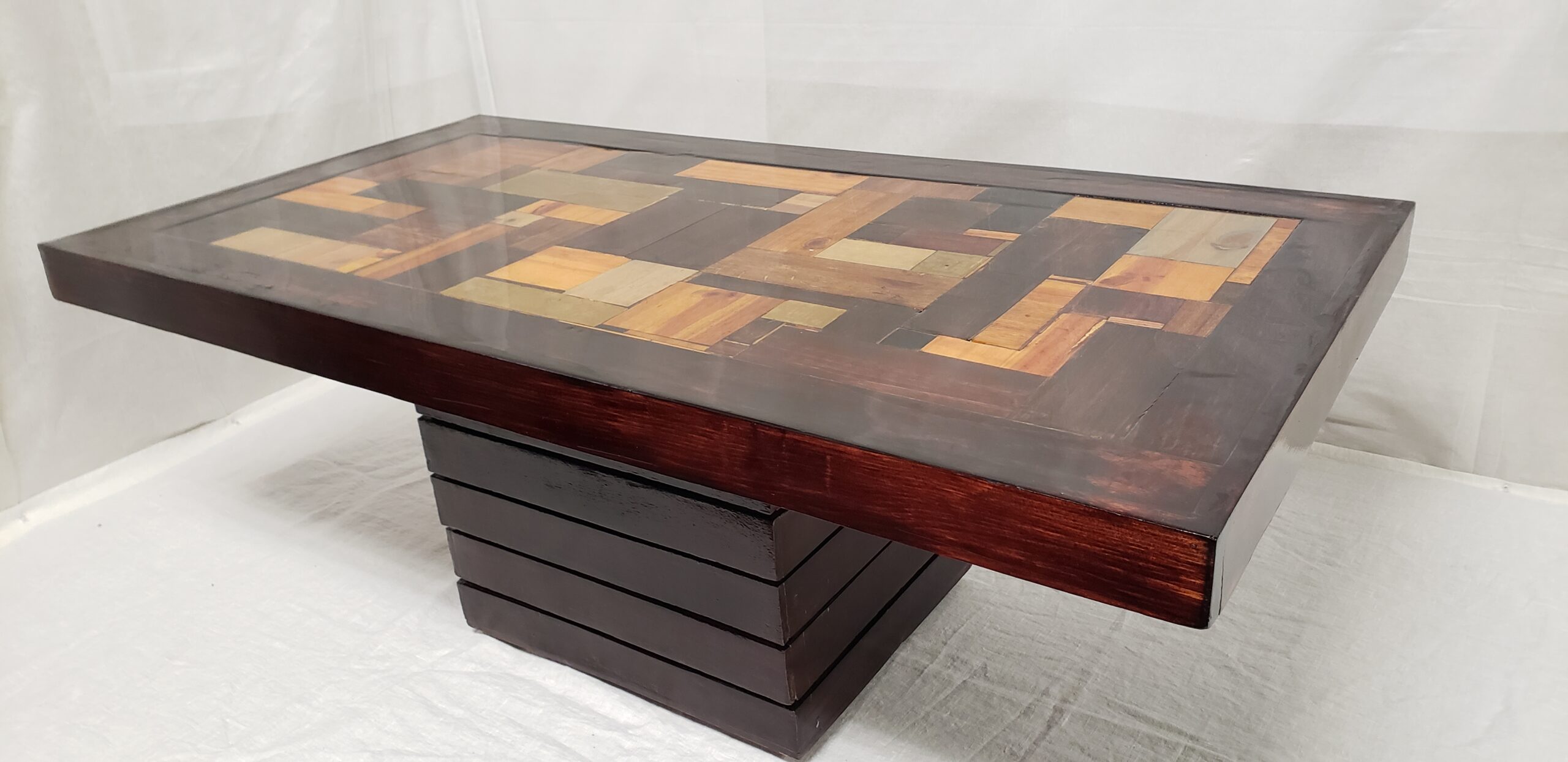 ORGANIZED CONFUSION 1 is a whimsical handcrafted table showcasing an impressive display of colours and stains. The tabletop is made from randomly arranged offcut wood in various shapes and sizes, surrounded by a pine frame, and sits atop a dark stained base. The high gloss finish gives it a shiny, light- reflecting look. The table is available in two sizes.
