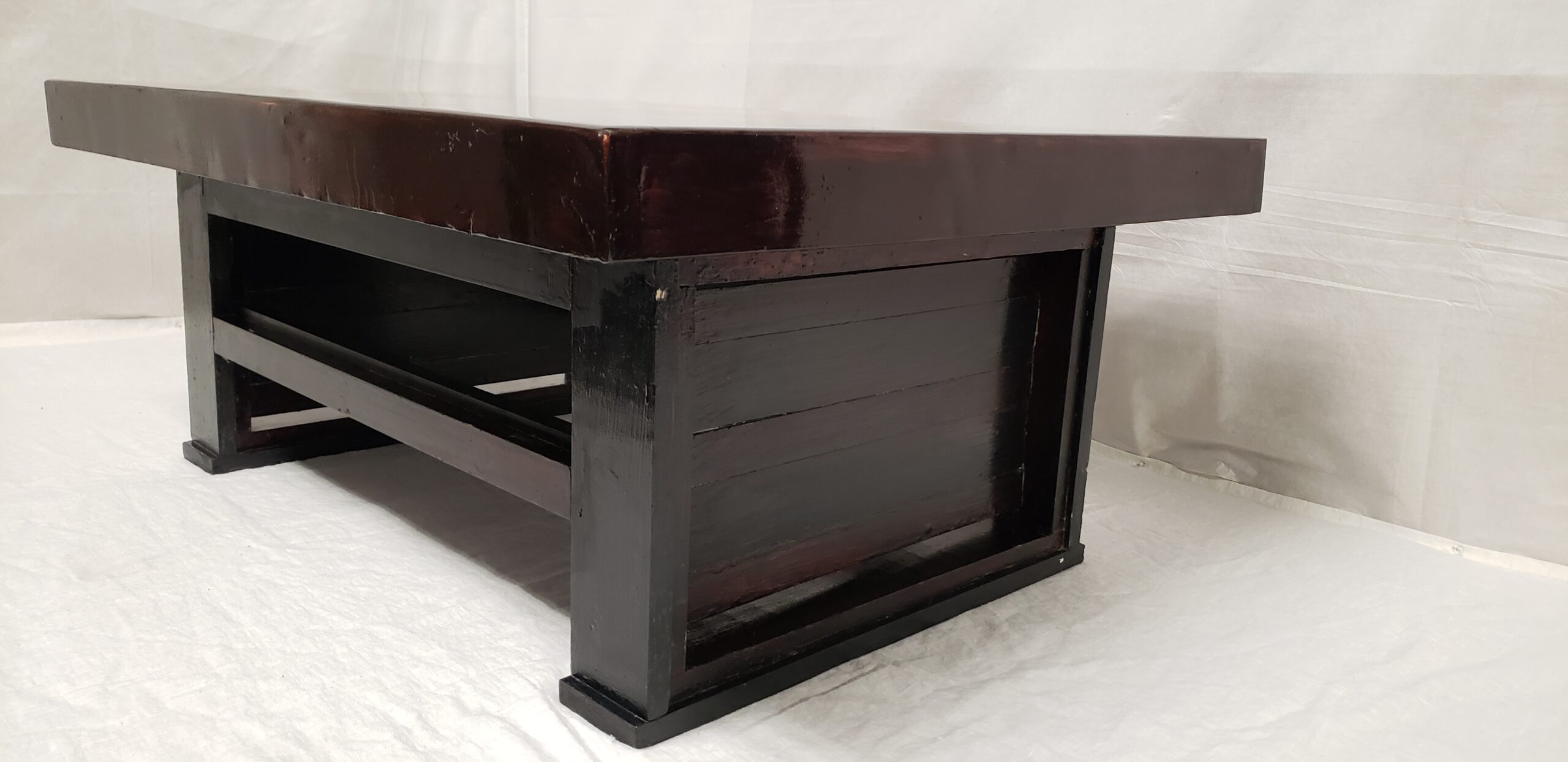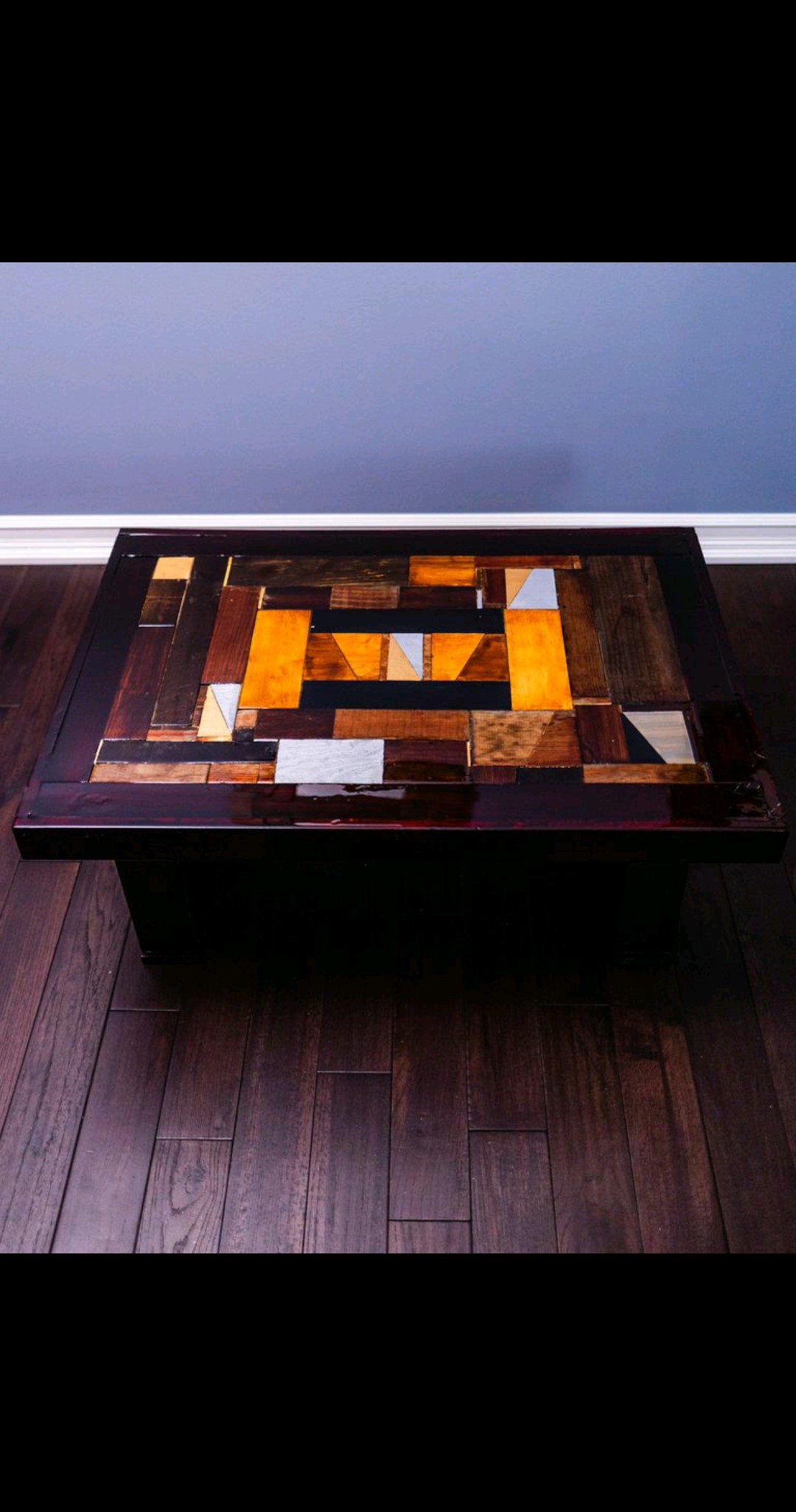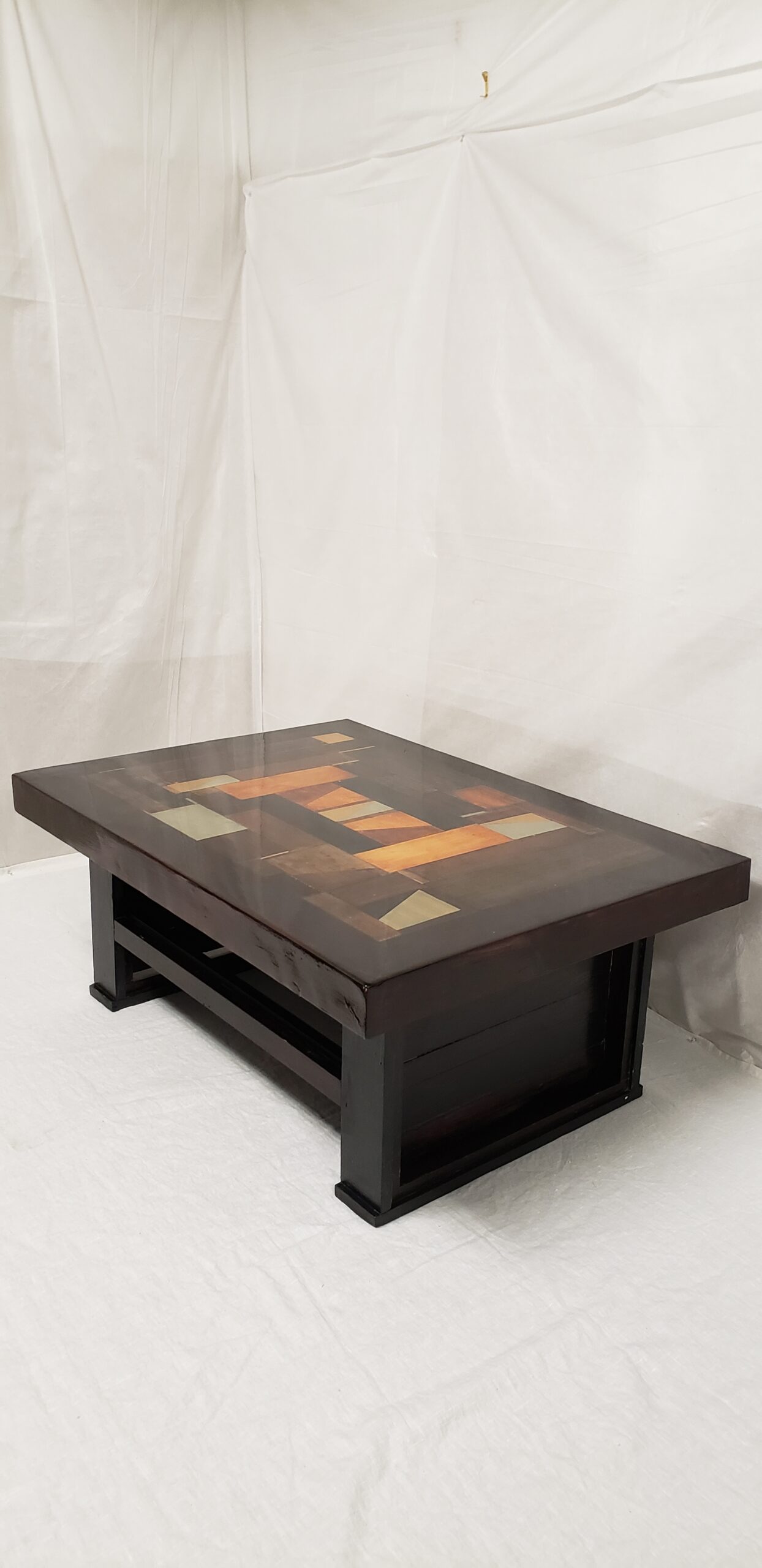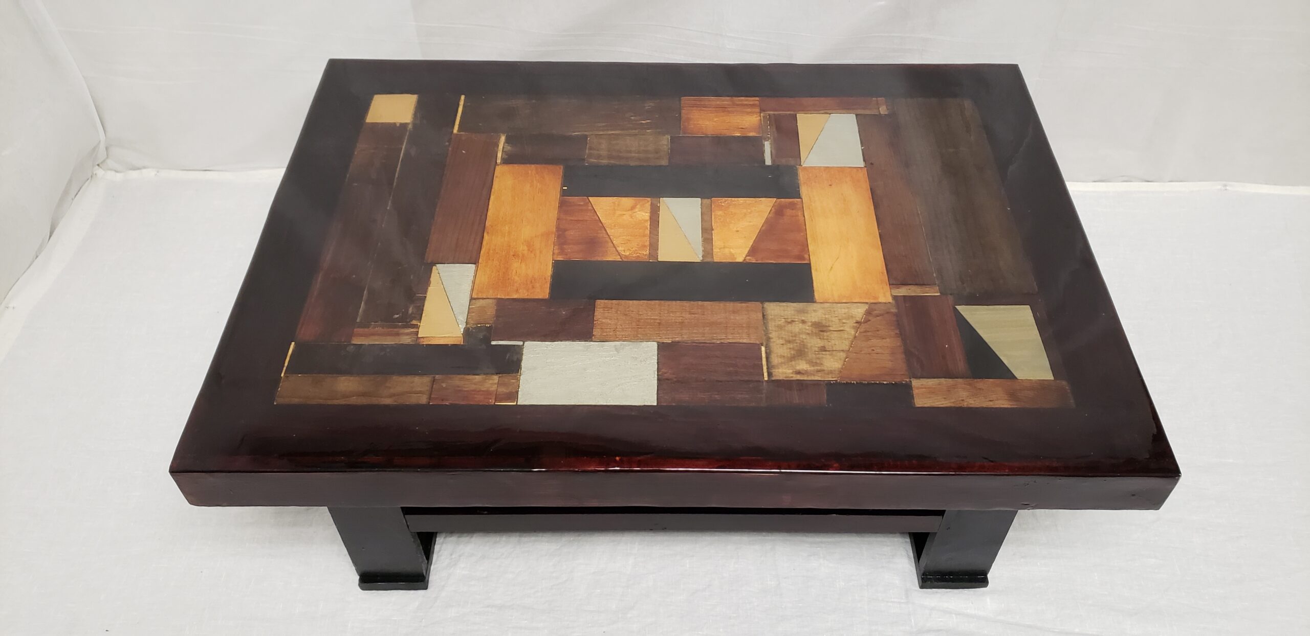 ORGANIZED CONFUSION 2 is a whimsical handcrafted table showcasing an impressive display of colours and stains. The tabletop is made from randomly arranged offcut wood in various shapes and sizes, surrounded by a pine frame, and sits atop a dark stained base. The high gloss finish gives it a shiny, light- reflecting look. The table is available in two sizes.